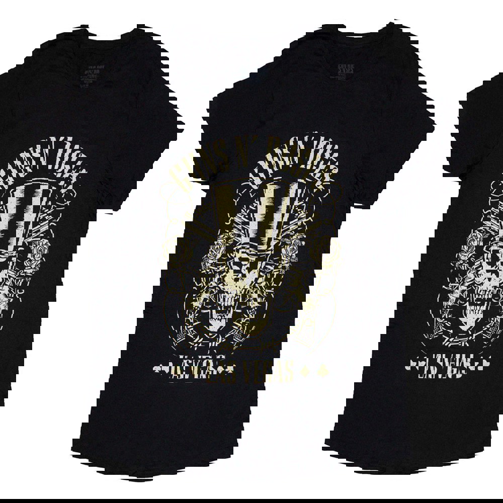 An official licensed Guns N' Roses Ladies Tee featuring the 'Top Hat, Skull & Pistols Las Vegas' design motif. This high quality t-shirt design is available in the black colourway. We offer a range of sizes from Small through XX-Large, subject to stock availability.