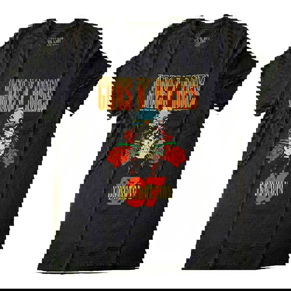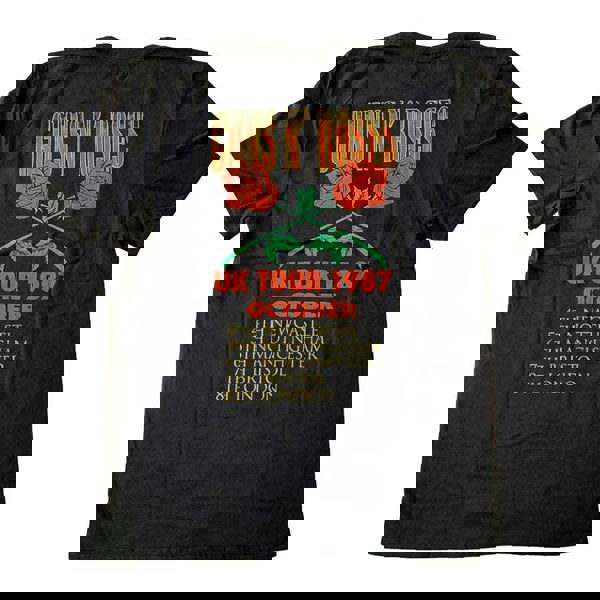 An official licensed Guns N' Roses Unisex T-Shirt featuring the 'UK Tour '87' design motif. This high quality T-Shirt is available in a black colourway. Classic fit short sleeved soft-style cotton tee with front & back printing. Comes in a wide range of sizes from Small through XX-Large, subject to availability.