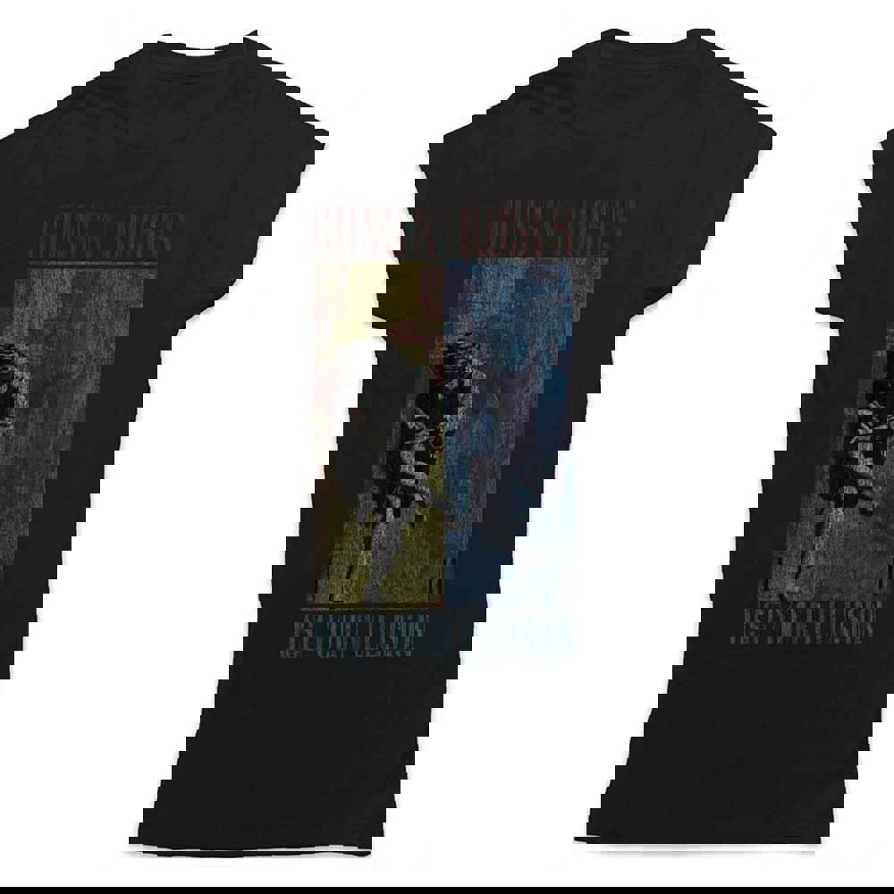 New and official band merchandise Guns N' Roses women's skinny fit T-shirt Tee showing the Use Your Illusion Logo graphic design on soft-style cotton. This high-quality t-shirt is available in a black colourway. Size options include Small through XX-Large.