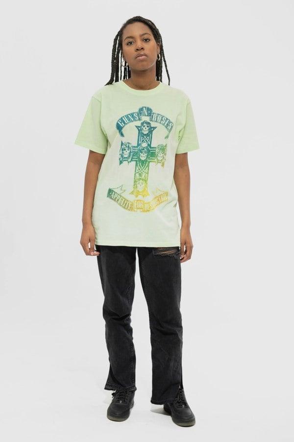 An official licensed Guns N' Roses Unisex T-Shirt featuring the 'Gradient Use Your Illusion Tour' design motif. This high quality T-Shirt is available in a green colourway. A high quality dye wash soft-style cotton tee with short sleeves, crew neck with front and back printing. The Wash Collection 2022 features a range of unique tees made from 100% cotton and feature a range of finishes including Dip-Dye, Tie-Dye & Snow Wash. Comes in a wide range of sizes from Small through XX-Large, subject to availability.