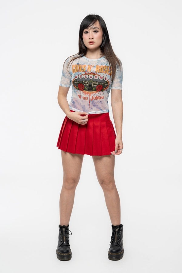 An official licensed Guns N' Roses Ladies Mesh Crop Top featuring the 'Welcome To The Jungle LV' design motif. This high quality Mesh Crop Top is available in a white colourway. Refined and stylish, this exquisite mesh fitted Mesh Crop Top embodies the essence of high fashion. Crafted with meticulous attention to detail, it boasts a mesmerizing all-over sublimation print that extends throughout. Comes in a wide range of sizes from XX-Small through X-Large, subject to availability.