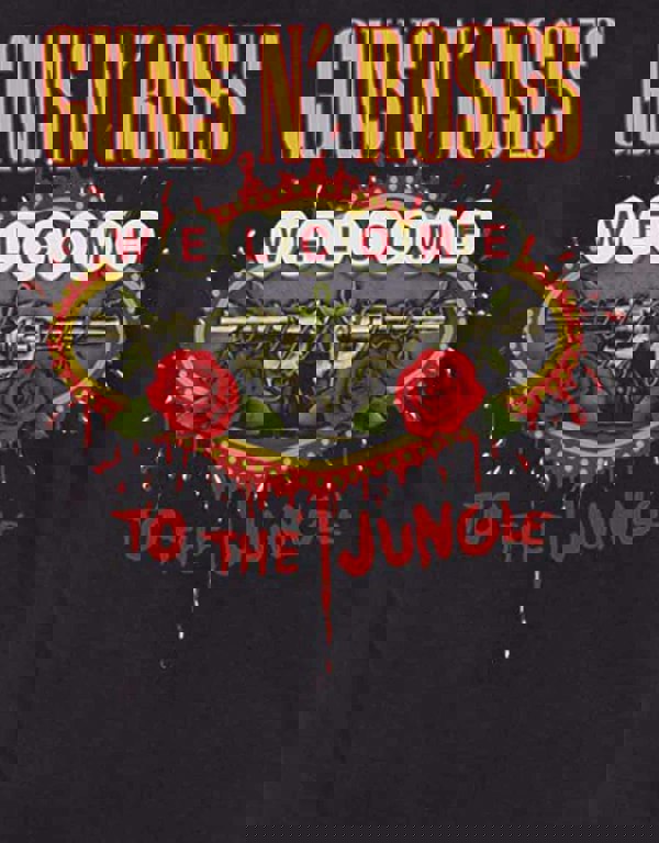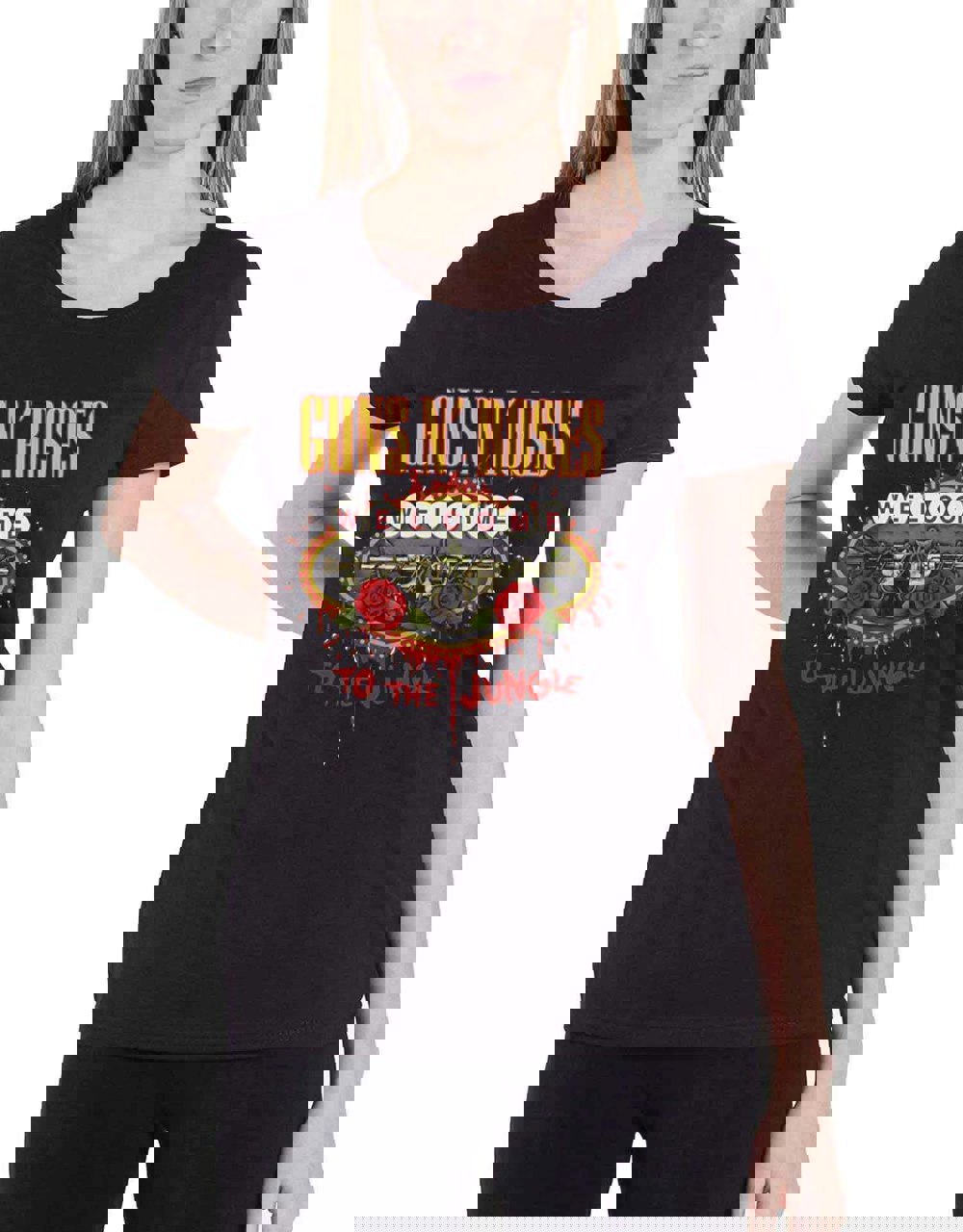 New and official band merchandise Guns N' Roses women's skinny fit T-shirt Tee showing the Welcome to the Jungle graphic design on soft-style cotton. This high-quality T-shirt is available in a black colourway. Size options include Small through XX-Large.