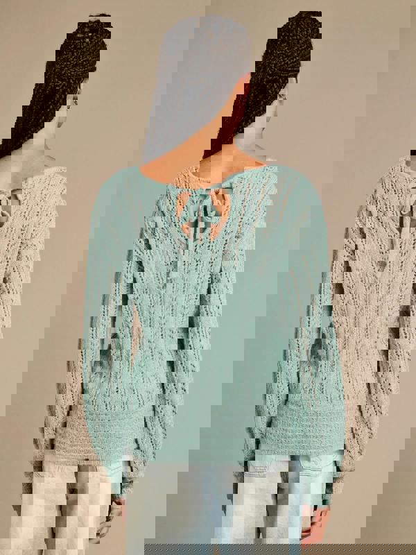 Stay cosy and chic with the Arla-Bailey Aqua Wool Knit Top. Crafted in a soft pointelle knit, this relaxed-fit top features a V-neck with a delicate tie at the back, adding an elegant touch to your winter wardrobe. The duck egg hue brings a fresh pop of colour, perfect for layering over jeans for casual days or pairing with a skirt for a polished finish.