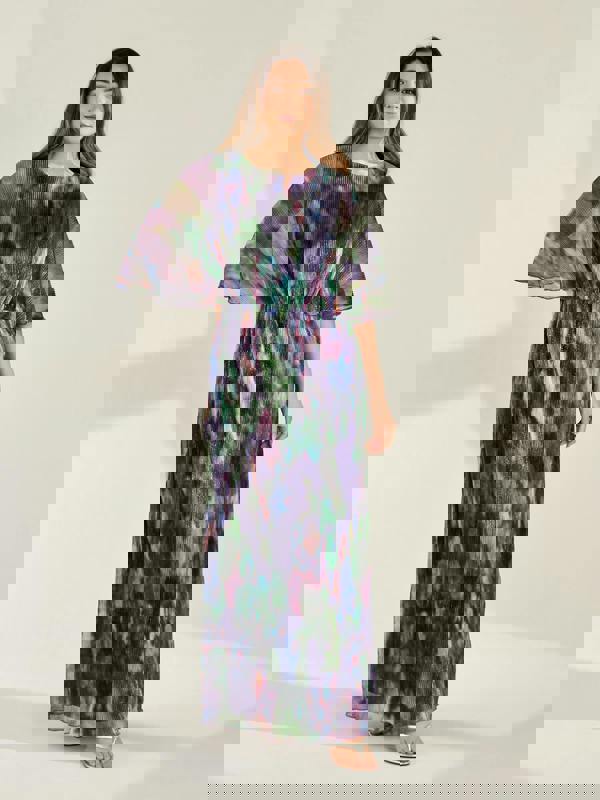 A must-have for all occasions, the Cameron Metallic Dress has an abstract print on a light metallic, plisse fabric. This maxi dress creates a flattering silhouette, with cape style sleeves, an elasticated waistband, and a straight skirt. Its lightweight design guarantees effortless comfort at garden parties and weddings.