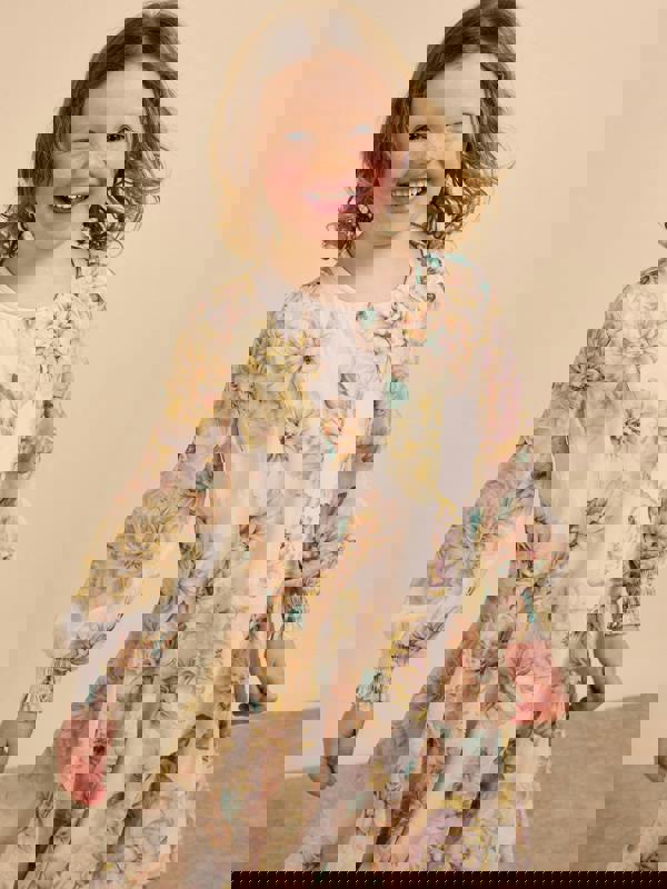 Make every moment magical with the GWD Camille Printed Floral Dress a charming style designed for days full of fun and movement. Featuring a pretty multi floral print on a soft cream base, this dress is finished with long sleeves and elasticated cuffs for comfort and ease. The just below knee length skirt is made for twirling, making it perfect for special occasions or everyday adventures.