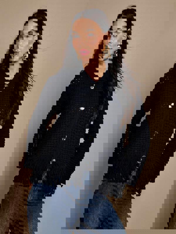 Add a playful twist to your everyday style with the Daria Tassel Cardigan. Designed to elevate any outfit, this statement knit features soft tassels along the hem and elegant mother-of-pearl buttons in a contrasting smoke tone. Perfect styled with jeans or tailored trousers, it’s a chic yet effortless cardigan that brings movement, texture, and personality to your autumn wardrobe.