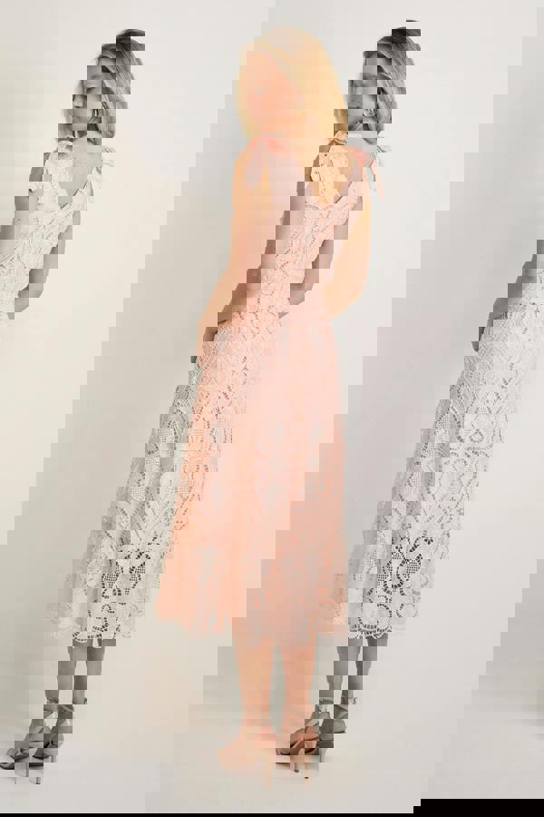 Romantic cut lacework shines through on this summer staple, an ultra-flattering fit and flare dress. Feminine V shape neckline is adorned with delicate bow tie shoulder details. This sleeveless dress will enhance its sense of vintage charm, makes it the perfect summer dress to wear with either a heel or sandal.