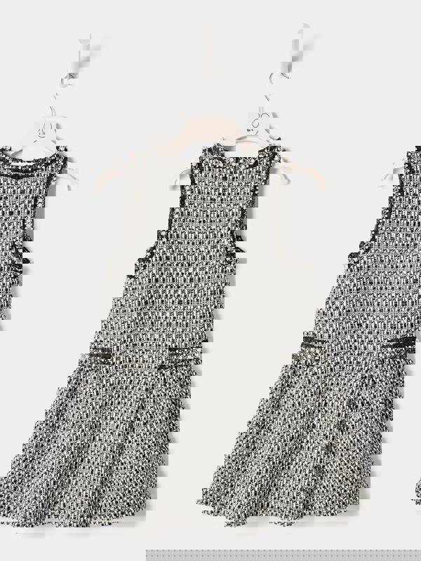 Cut in luxurious black-and-white bouclé, this sleeveless pinafore delivers polished style with zero effort. Pearl-and-crystal trims frame the neckline and armholes for subtle sparkle, while a grosgrain bow at the chest adds a sharp, tailored touch. Soft pleats at the waist create gentle volume without bulk — refined, comfortable, and made to move.