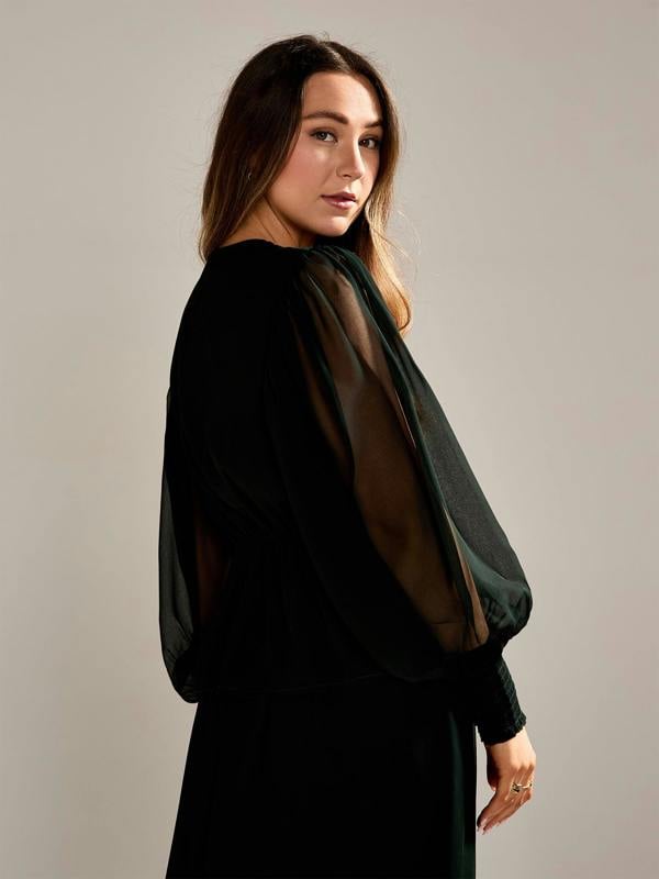 GWD Floral Embellished Sparda Top in Dark Green The Floral Sparda Top brings effortless elegance with its mock wrap neckline and sparkling embellishments. The shirred cuffs and elasticated waistband create a flattering and comfortable fit. A perfect option for stylish yet modest dressing.