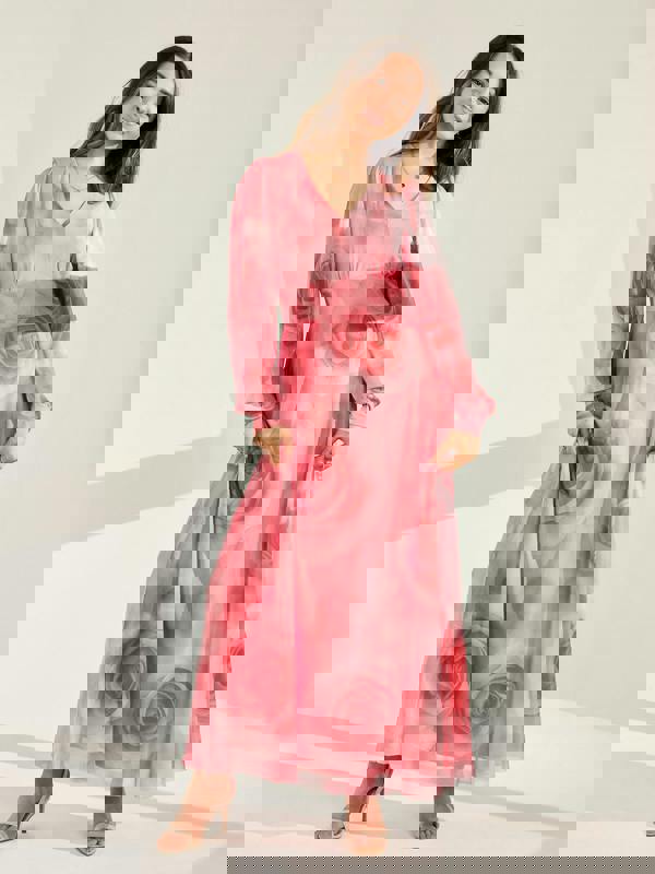 GWD Genevieve Dress in Petal Pink - Soft and romantic, the Genevieve Pink Dress features a delicate tonal floral print on a flowing mesh base. The deep waistband and flattering silhouette make this maxi dress ideal for weddings, special occasions, Ramadan, and Eid. A perfect choice for refined, modest styling.