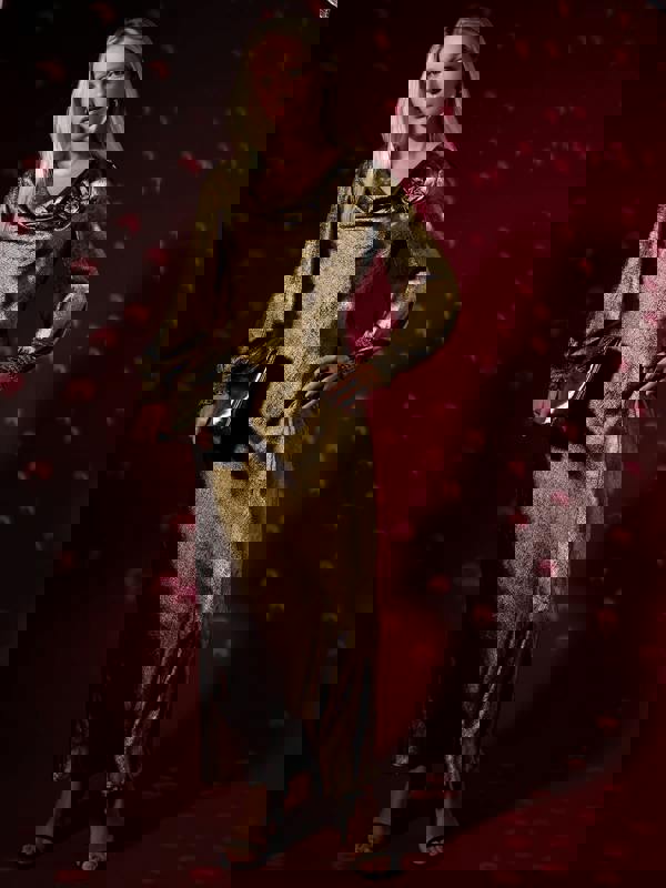 Turn heads at your next event with the Juliet Gold Metallic Maxi Dress, a stunning piece that exudes glamour and sophistication. The shimmering metallic gold fabric drapes elegantly, while the cowl neck and long sleeves with shirred cuffs add a touch of vintage allure. A corsage detail at the chest adds an extra layer of luxury, making this dress perfect for formal dinners, cocktail parties, or any special occasion where you want to shine. Pair it with delicate accessories for a truly show-stopping look.