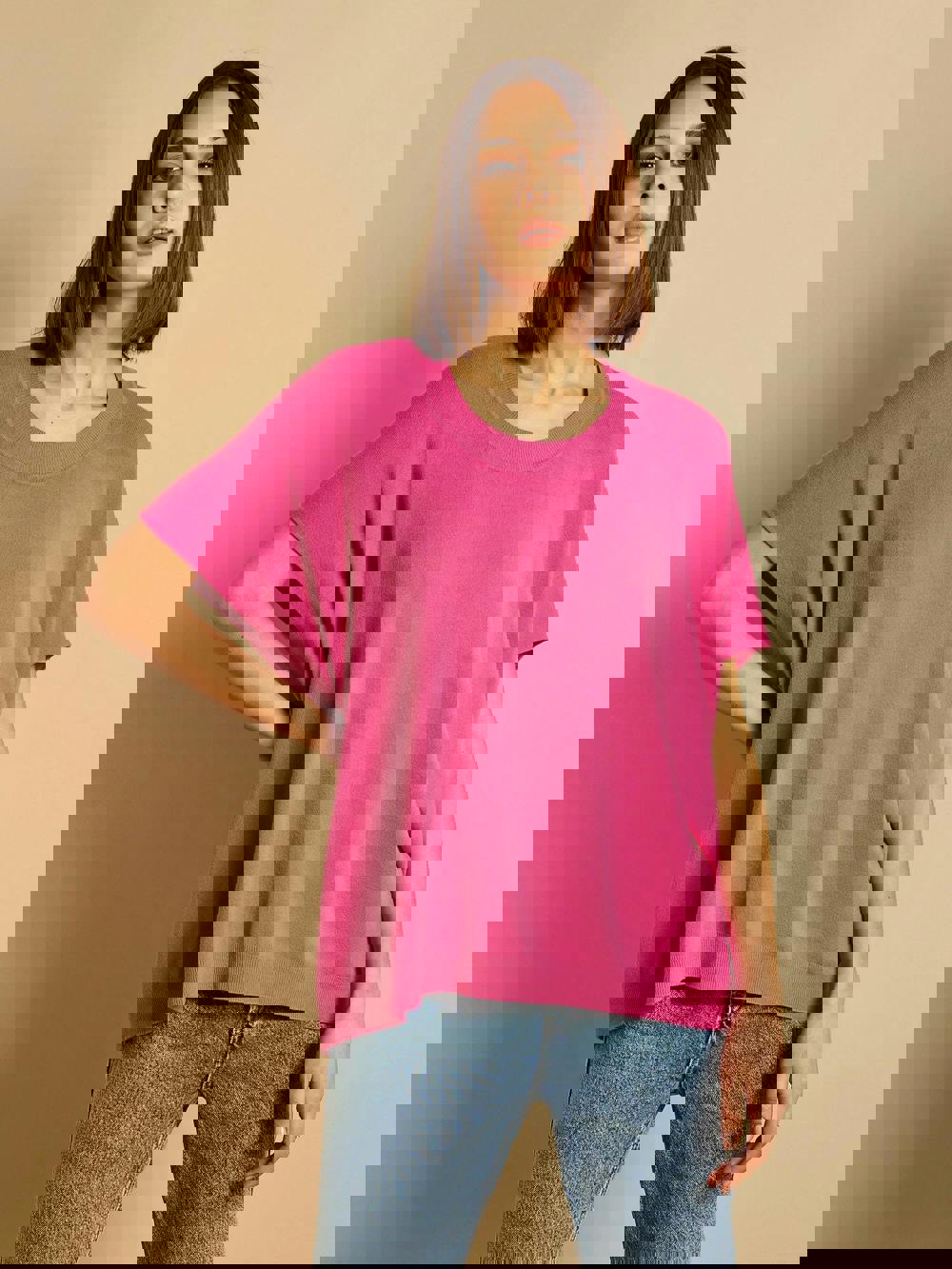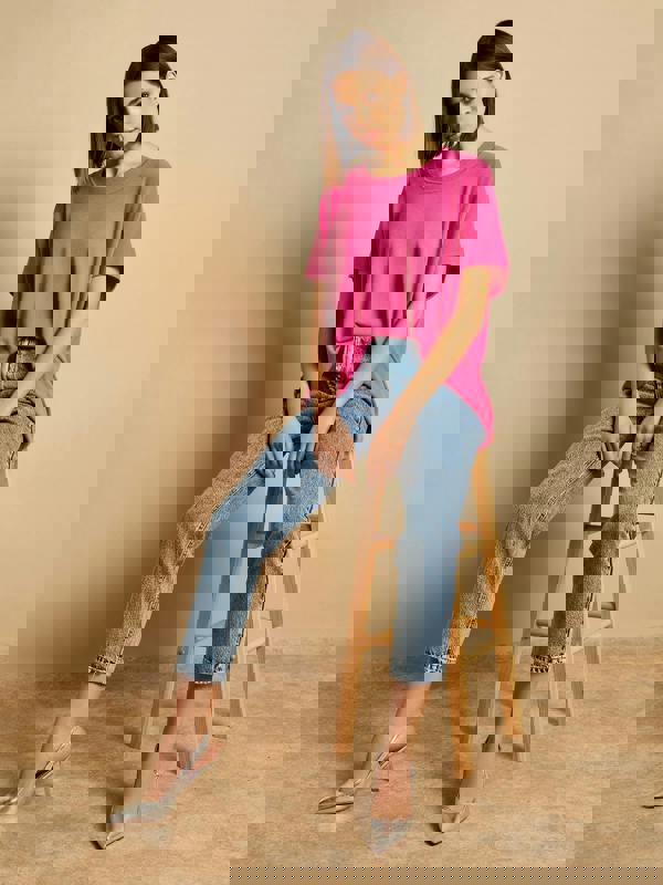 Wrap yourself in effortless style with the Katerina Short Sleeve Oversized Jumper. Made in Italy from a soft viscose blend, this fine knit jumper features a relaxed fit, round neckline, and grown on short sleeves, making it perfect for casual or dressed-up looks.