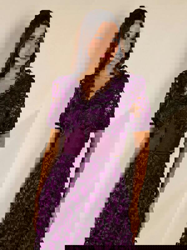 Get ready for party season with the Paola Lace Top. Made in a delicate purple lace, this button front top features short puff sleeves and v-neckline. We love the additional back bow tie detail that radiates undeniable femininity! Style with the coordinating Paola Lace Skirt for the ultimate pretty outfit!