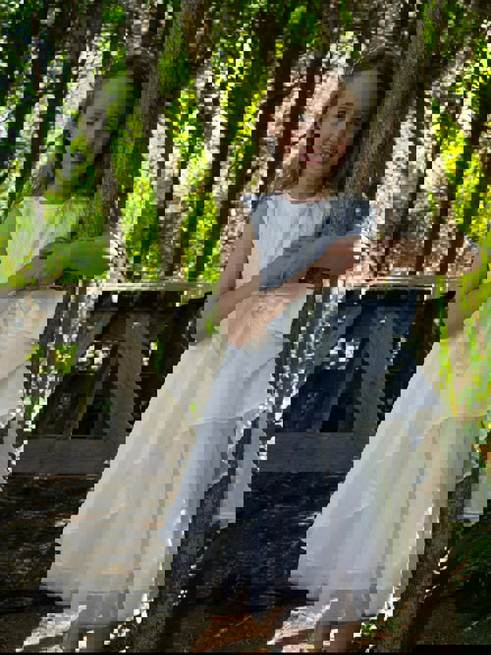 Steal the spotlight in our Pearl Drop Dress in elegant white. Adorned with a statement bow and delicate pearl embellishments, this floaty layered dress is perfect for flower girls, birthday girls, and party princesses alike. Style it with ballet flats and a headband for the ultimate special occasion look.