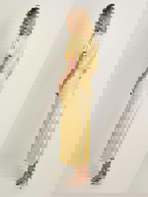 Timeless yet contemporary, this yellow satin midi dress brings understated drama to your wardrobe, ideal for special moments that call for confidence and polish.