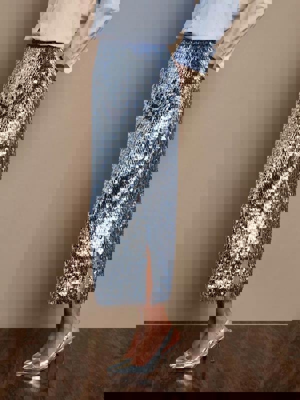 Make a shimmering statement this season with the Sequin Midi Skirt — a show-stopping piece designed to catch the light and command attention. Crafted with layers of light-reflecting sequins, it moves beautifully with every step, creating a liquid metallic effect that’s both modern and glamorous.