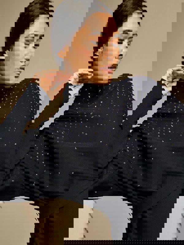 Elevate your everyday style with the Sparkle Iris Knitted Navy Top, a chic piece that combines comfort with elegance.