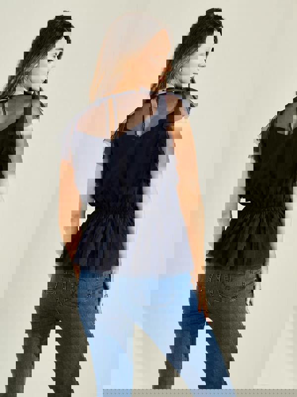 Shimmer in style with the GWD Zoey Sparkle Top, crafted from sheer navy mesh and adorned with delicate hand beaded embroidery. The feminine fluted sleeves and peplum hem create a flattering silhouette, making it perfect for evening drinks, special occasions, or a night out.