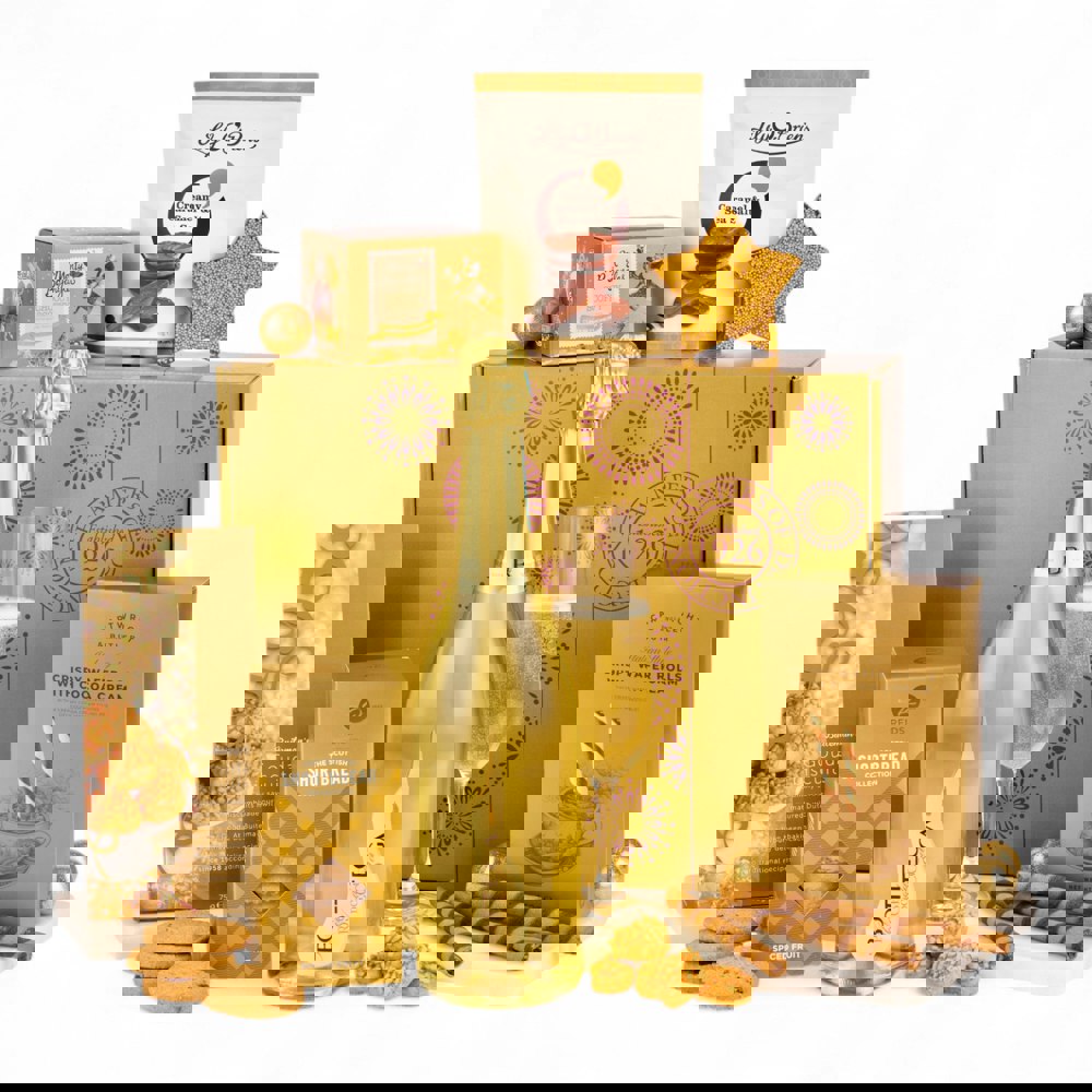 Our most popular gift for good reason, The Elegance Sparkling brings together timeless style, irresistible flavours, and the unmistakable joy of celebration. Presented in a radiant gold gift box, it’s a show-stopping hamper that makes every occasion feel truly special.