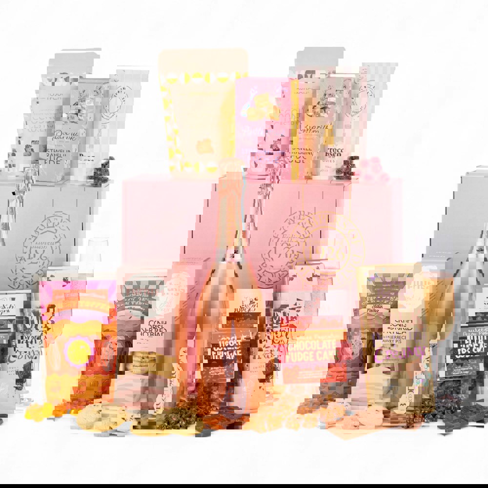 This indulgent gift set is brimming with carefully chosen gourmet delights to complement the Prosecco’s charm. Savour the buttery richness of Furniss Cornish Shortbread with Strawberry Pieces, paired with the irresistible Great British Dessert Collection Sticky Toffee Pudding Cookies. For something lighter, enjoy the crunch of Joypouch Coconut Clusters alongside Joe & Seph’s Chocolate Fudge Cake Popcorn, a playful treat with a luxurious twist.