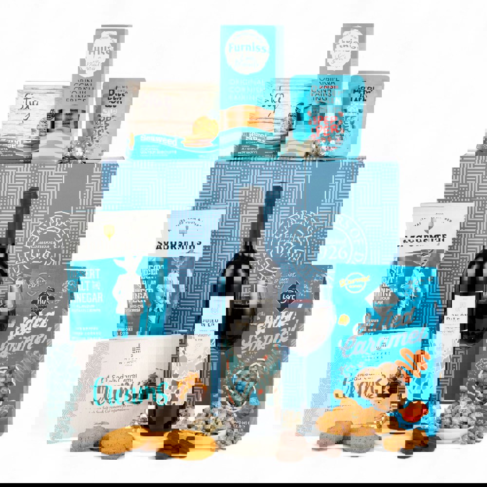 Don Leon Red 75cl, Furniss Original Cornish Fairings 180g, Whitakers Salted Caramel Creams 150g, Savoursmith Desert Salt & Vinegar 40g, Love Popcorn Salted Caramel 100g, Better With Salt & Pepper Almonds 30g, Stag Cocktail Water Biscuits with Seaweed 100g, Packed in a blue geometric branded gift box.