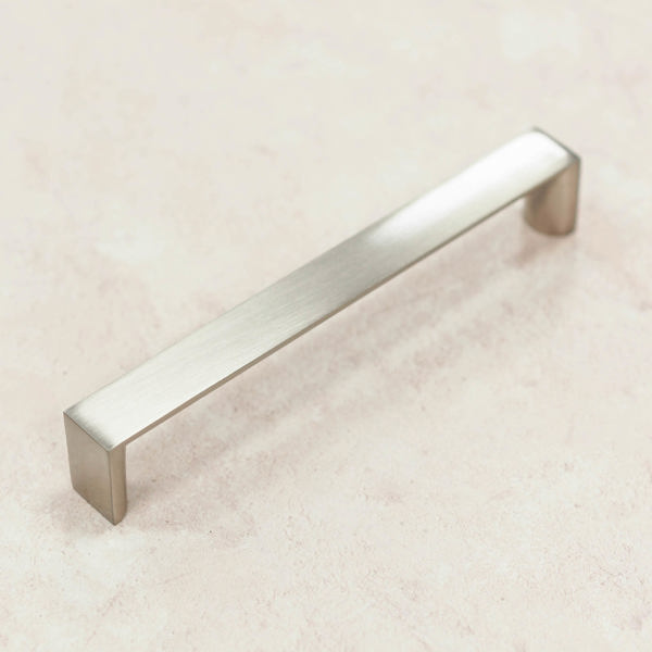 A 160mm Brushed Nickel Square D Handle A simple, angular, D shaped handle, ideal for refreshing kitchen cabinets, wardrobes ,office or bathroom furniture. With a brushed nickel finish, this handle is sure to suit most décor schemes.
