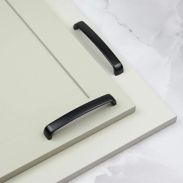 Add modern, matt black handles to your home for an instantly updated look. Black hardware is a bold, clean, neutral that will sit well with most other colours. The softly squared d-bar pull and gently curved ends of these cupboard handles results in an effortless yet styled look. In a length that suits most projects, these handles make the perfect final touch to kitchen or utility unit cupboard doors & drawers as well as furniture & wardrobes. With a strong, matt black finish, this handle will easily lift & update any interior project with an easy bit of DIY.