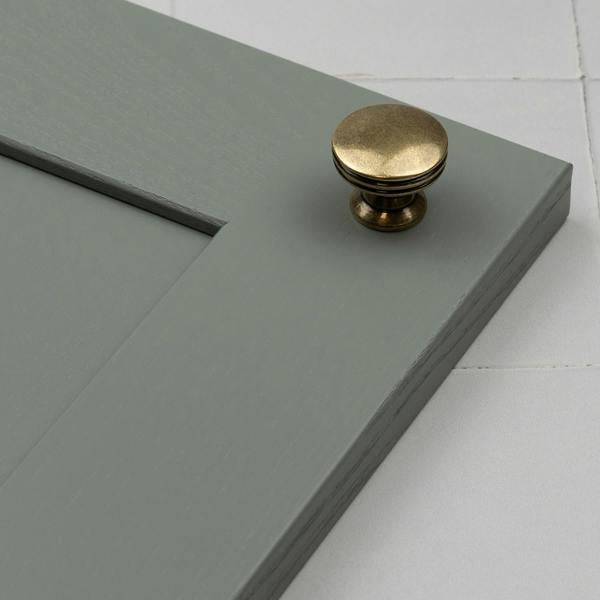 A contemporary style knob with an antique finish. This knob features a simple smooth rounded face, encompassed by a bolder broad rim with even ridge design elements and a unique, layered profile for an interesting character and comfortable grip. The stem descends down into a gently curved slope with grooved detailing around the rose. The aged brass adds classic sophistication and soft golden undertones to an otherwise modern silhouette. Eye-catching hardware like these can be used for anything from DIY furniture upcycling to finishing a bespoke kitchen design.