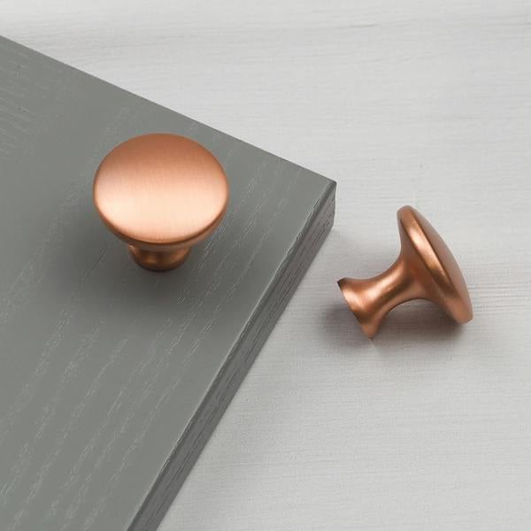 Simple and classic, this copper knob offers a button mushroom shape and shaker style. Featuring a flat face, rounded edges and small rose, for an elegant, modern addition to a kitchen or bathroom. The gold and brown undertones and slightly reflective surface provide a tasteful finish, an ideal choice in both functionality and aesthetic. This thoughtful design and traditional shape allow for use in modern style homes as well as more traditional styles. A versatile piece, in a popular satin copper finish can be utilised and enjoyed individually or paired together for a simple yet effective final touch on furniture and cabinets around the home.