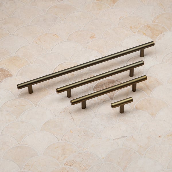Simple and elegant aged brass hardware in three lengths. A classic bar handle design in a softly brushed, antique brass finish. The muted brass tone, and smooth brushed effect to the brass colour gives a more subtle, timeless look than bright gold toned brass hardware. Functional and slimline, these handles can be used to freshen up an existing space or a full kitchen renovation.