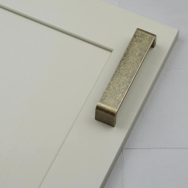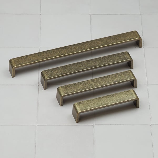 Marrying the best of two styles, these distressed brass cabinet handles are modern in shape but aged in finish. The d-bar handles each feature a strong, squared central bar that is softened with gently curved ends. The carefully aged brass finish reveals lighter and darker golden tones across the handles giving the design depth and character. The practical, minimal modern shape coupled with the rustic brass finish, mean this hardware collection will sit well with many kitchen designs and home aesthetics. Complete all sizes of kitchen cupboard doors & drawers by using various sizes, fit either horizontally or vertically, for an understated yet cohesive scheme. Durable, refined and effortlessly stylish, these door pulls are an ideal choice to update tired furniture, wardrobe doors, bathroom unit drawers and other items throughout the home.