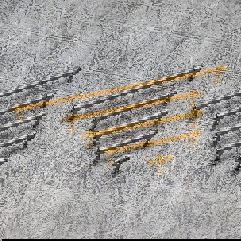 Distinct in design, this collection features a cylindrical central bar layered with an overlocking clasp detail that seamlessly connects feet to bar. The feet remain simple with a single layered rose at their base, leaving the eye to focus on the unique detailing of the bar pull. Finished in a carefully aged, rustic brass these handles will sit well with many colour schemes, and each one will be unique. Available in 4 lengths, plus a matching t-bar knob, this collection can be used across homes & design projects that feature door & drawer fronts of all sizes. Choose just one, or a mix of sizes to easily complete or update projects around the home. The bar handles work well both horizontally and vertically to easily upgrade kitchen door fronts, wardrobe doors, cupboard drawers and many more.