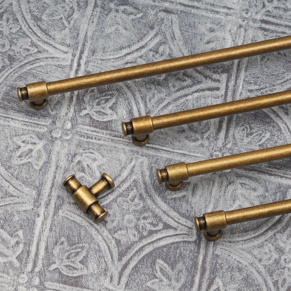 Distinct in design, this collection features a cylindrical central bar layered with an overlocking clasp detail that seamlessly connects feet to bar. The feet remain simple with a single layered rose at their base, leaving the eye to focus on the unique detailing of the bar pull. Finished in a carefully aged, rustic brass these handles will sit well with many colour schemes, and each one will be unique. Available in 4 lengths, plus a matching T-bar knob, this collection can be used across homes & design projects that feature door & drawer fronts of all sizes. Choose just one, or a mix of sizes to easily complete or update projects around the home. The bar handles work well both horizontally and vertically to easily upgrade kitchen door fronts, wardrobe doors, cupboard drawers and many more.