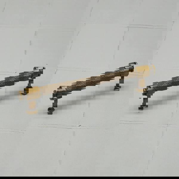 Distinct in design, this collection features a finely knurled cylindrical central bar layered with an overlocking clasp detail that seamlessly connects feet to bar. The feet remain simple with a single layered rose at their base, leaving the eye to focus on the unique detailing and texture of the bar pull. Finished in a carefully aged, rustic brass these handles will sit well with many colour schemes, and each one will be unique. Available in 4 lengths, plus a matching t-bar knob, this collection can be used across homes & design projects that feature door & drawer fronts of all sizes. Choose just one, or a mix of sizes to easily complete or update projects around the home. The bar handles work well both horizontally and vertically to easily upgrade kitchen door fronts, wardrobe doors, cupboard drawers and many more.