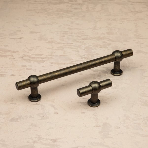 A modern classic T-bar handle and matching knob. Finished in a cosy antique brass for an elegant touch, these pulls are sure to update kitchens, homes and furniture nicely. Featuring a broad, rounded central bar anchored by a curved clasp detail at the rose - adding a subtle architectural touch. The T-bar pull showcases a softly contoured grip with chamfered ends that soften the profile, while the wide round roses provide a solid foundation for a grounded, symmetrical look. This family is a crowd pleaser, with a versatile design and popular finish, seamlessly blending into both contemporary and traditional interiors with a timeless finish. Use these pulls horizontally or vertically for an easy update in any restoration project.