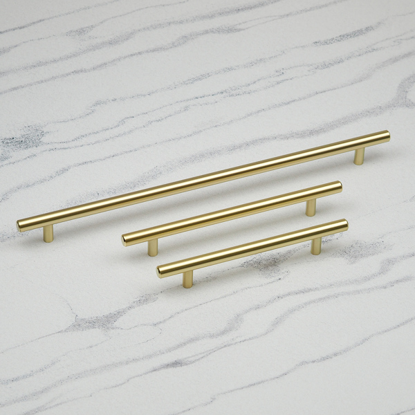Introducing a simple, classic cupboard pull design featuring a minimalist style and elegant bar with a light, golden, brushed brass finish. Offering a strong t-bar and comfortable grip with chamfered ends for a refined, understated elegance. The clean lines and thoughtful design make for a perfect fit for both classic and contemporary interiors. A functional yet stylish option, these cupboard bar handles have a soft, brushed detail finish and simple, cylindrical feet. These furniture pulls in a contemporary gold brass finish, are an ideal choice for an effortless refurb to tired kitchens, cupboards and furniture. With a choice of three sizes, this brass finish hardware is ideal to fit on various door & drawer sizes around the home.