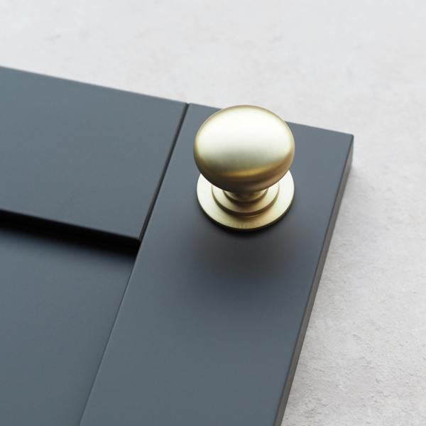 A collection of handles with a brushed brass finish ideal for anything from small home projects through to full kitchen renovations. Each style has a soft gold tone and is a sleek way to bring brass accents into your home. The cup handle has a half moon, curved shape and is a traditional style that works well with farmhouse or Shaker style kitchen units, as well as cabinets, dressers or drawers that are in need of a refresh. The 160mm handle is a more modern shape with a contrast between the sharp edges of the handle and the smooth brushed finish. The larger, 42mm knob has a smooth, rounded shape on a generous scale. The fixed, layered backplate and strong silhouette finished with a soft gold tone make this a bold piece. Alternatively, the 38. 5mm knob offers a scaled down option & different overall style. With a round face & slightly convex front that meets a defined, edged rim, this pull is big enough to stand out without overpowering door and drawer fronts. Used alone or by combining styles, these pulls are sure to be a stand out design feature.