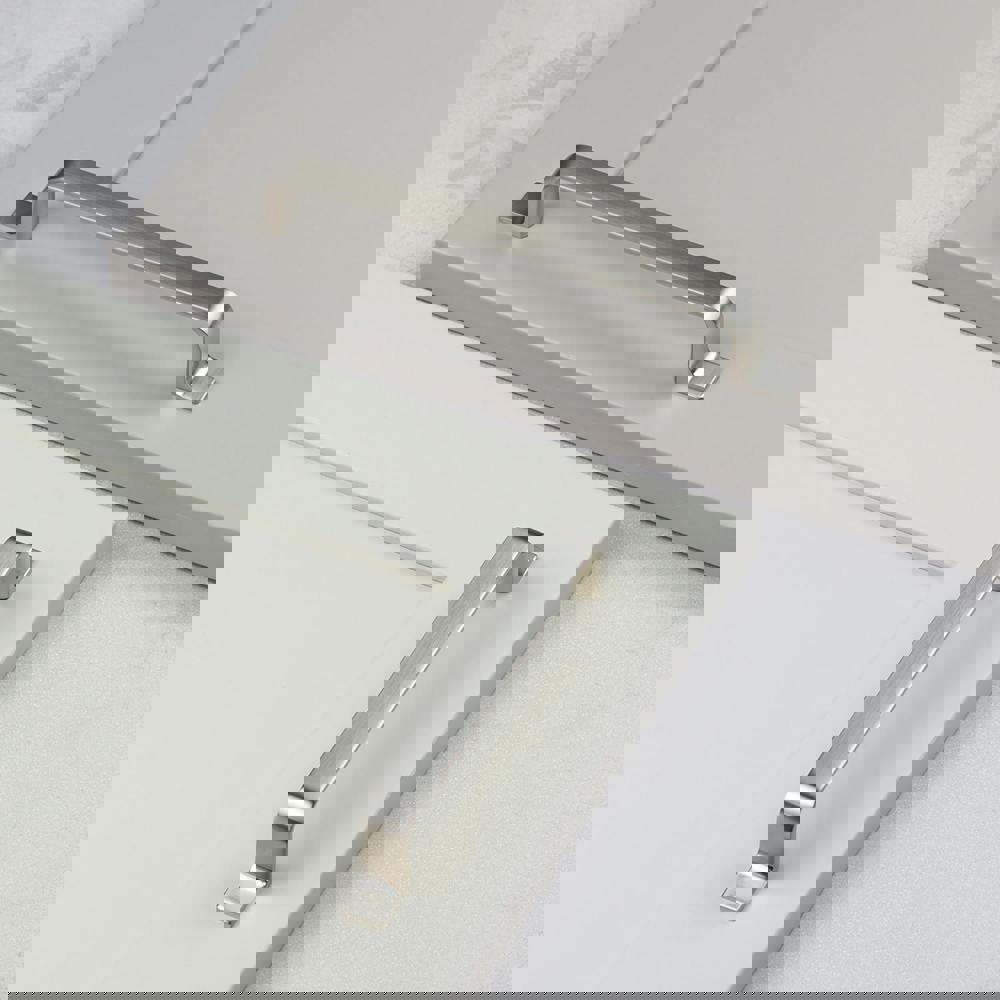 Add a versatile, brushed nickel finish to your bedroom cupboards or cabinet doors with this clean, modern shape. The design features a straight central bar leading to gently curved ends that flatten to seamlessly meet the door or drawer front. Available in 2 lengths, these handles make the perfect final touch to kitchen cupboards, drawers and wardrobes. With a classic, neutral, brushed nickel finish, this handle will sit well with most interior colour schemes.