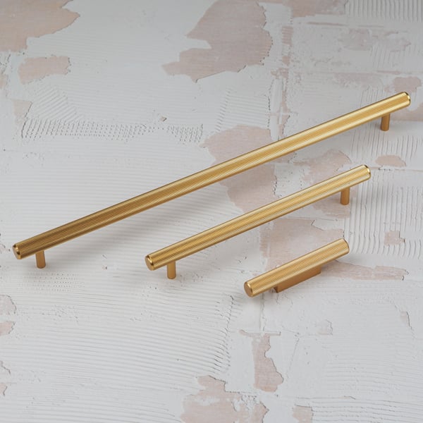 Featuring an intricate grooved texture along the barrel of each design, install our grooved bar pulls on kitchen door and drawer fronts to complete a modern, minimalist look. A mid-toned golden brass finish complements a range of colour schemes and with 3 sizes to choose from, you can easily complete your home DIY project with this hardware collection. Use the long, 320mm bar pull to upgrade wardrobe doors, choose the small bar pull knob to modernise tired bedside tables and the 160mm bar across kitchens and utility rooms.