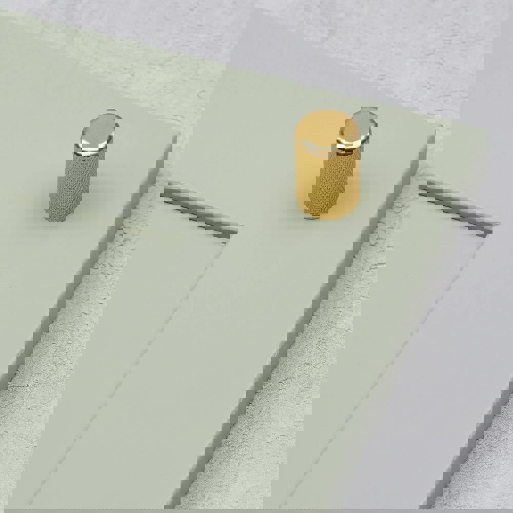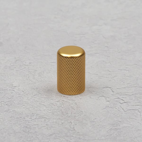 A Gold Knurled Knob These dainty, knurled cylinder knobs are a timeless hardware classic whether utilised for a bedroom, bathroom or kitchen. The diamond knurled texture, smooth face and simple cylindrical shape make these pulls easy to pair with a range of colours and interior schemes. For a more understated, minimalist feel, matt black hardware is a thoughtful choice. The industrial texturing is slightly more subtle set against a matt finish and black is the ultimate neutral, ideal for matching with most design schemes. The lack of harsh lines draws the eye to the finely knurled detail, resulting in an ageless pull knob, a quick and easy modification to transform any room. Use alone on kitchen unit door fronts or bedside table drawers or pair up on longer drawers for a styled end result.