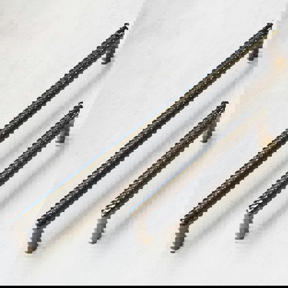 A duo of striking, knurled, D-shape handles. These handles have a textured, knurled, central bar section, with gently squared, polished ends. The gunmetal grey colour runs across all sections of the handles, but has a more polished finish at the ends. A unique style of handle sure to provide a statement finish. Ideal for kitchen cupboards and drawers, but equally for sprucing up furniture around the home.