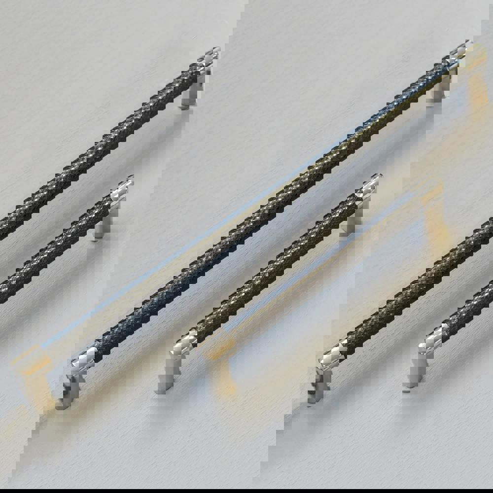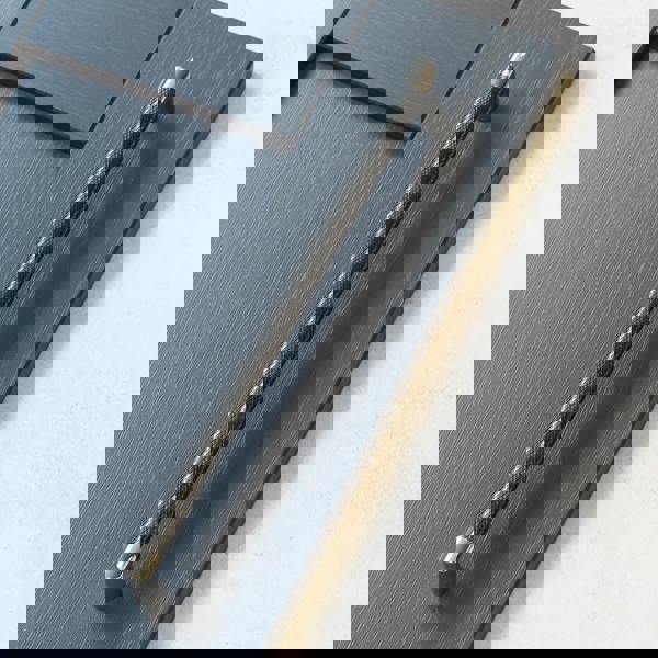 A striking, textured, D-shape handle in two lengths. These handles have a textured, gunmetal black, centre and gently squared, chrome ends. A truly unique handle offering a strong, masculine, almost industrial finish. The longer length handle makes these ideal for larger doors & drawers like those found on kitchen larders or wardrobes. You’re sure to make a statement with these handles – make sure it’s the right one by checking the measurements below! Ideal for kitchen cupboards and drawers, but equally for sprucing up furniture in bedrooms, dining or living rooms.
