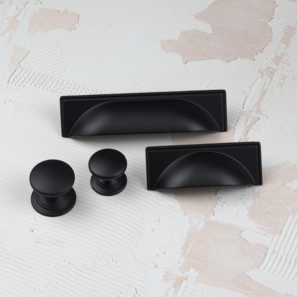 Add a contemporary finishing touch to your home with this collection of matt black cupboard handles. Providing an alternative to the traditional shape of a cup handle, these have a square surround creating a strong visual while keeping the practical cupped pull. Sat alone, or alongside the cups, both sizes of knob have an hourglass silhouette and added rose detail giving the look of a backplate. Install your favourite, or use two styles together, on upcycled furniture or make it your choice when updating kitchen cabinets & drawers, for an elevated end result.