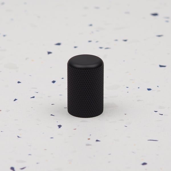 A Matt Black Knurled Knob These dainty, knurled cylinder knobs are a timeless hardware classic whether utilised for a bedroom, bathroom or kitchen. The diamond knurled texture, smooth face and simple cylindrical shape make these pulls easy to pair with a range of colours and interior schemes. For a more understated, minimalist feel, matt black hardware is a thoughtful choice. The industrial texturing is slightly more subtle set against a matt finish and black is the ultimate neutral, ideal for matching with most design schemes. The lack of harsh lines draws the eye to the finely knurled detail, resulting in an ageless pull knob, a quick and easy modification to transform any room. Use alone on kitchen unit door fronts or bedside table drawers or pair up on longer drawers for a styled end result.
