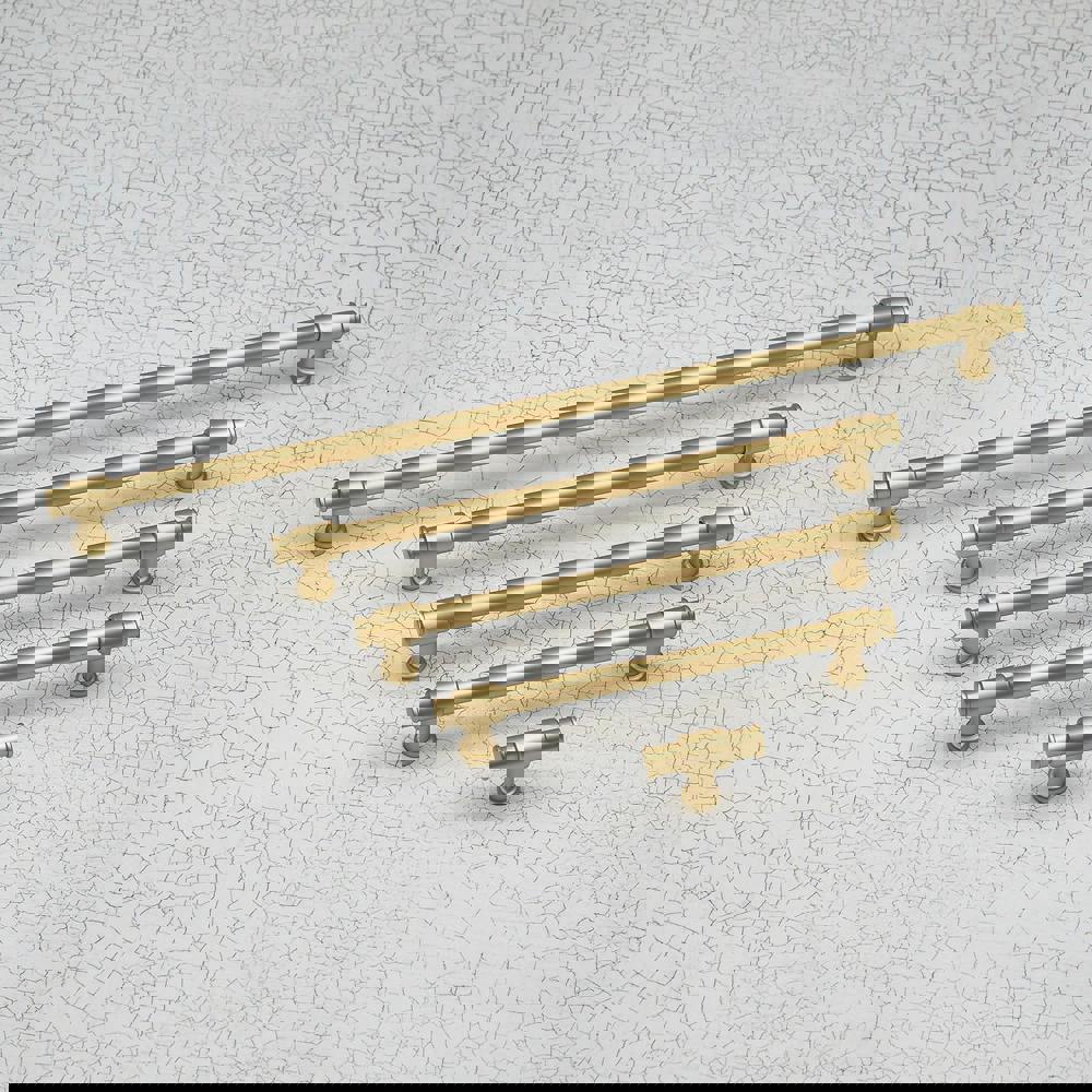 Distinct in design, this collection features a cylindrical central bar layered with an overlocking clasp detail that seamlessly connects feet to bar. The feet remain simple with a single layered rose at their base, leaving the eye to focus on the unique detailing of the bar pull. Finished in a mid-toned smooth, almost matt golden brass these handles will sit well with many colour & design schemes, from the modern and minimal to the more country traditional. Available in 4 lengths, plus a matching t-bar knob, this collection can be used across homes & design projects that feature door & drawer fronts of all sizes. Choose just one, or a mix of sizes to easily complete or update projects around the home. The bar handles work well both horizontally and vertically to easily upgrade kitchen door fronts, wardrobe doors, cupboard drawers and many more.
