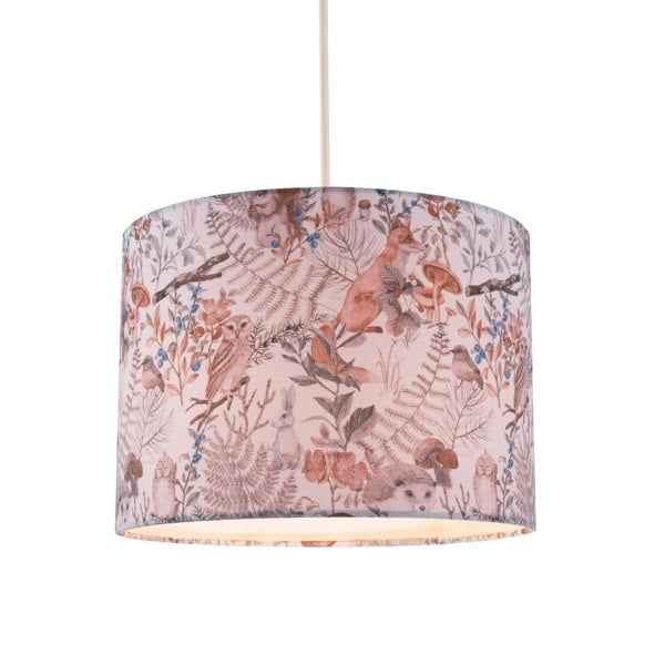 Creative and autumnal drum lamp shade decorated with floral accents and woodland animals including foxes, badgers, birds and owls.