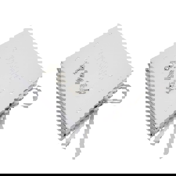 A beautifully designed and modern baby shower photo album in neutral grey with silver foil wording and small shiny silver plated 3D stars.