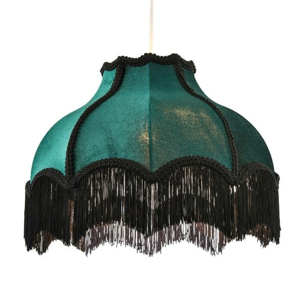 Features soft velvet fabric in dark shimmer emerald green with long black decorative lower hanging tassels.