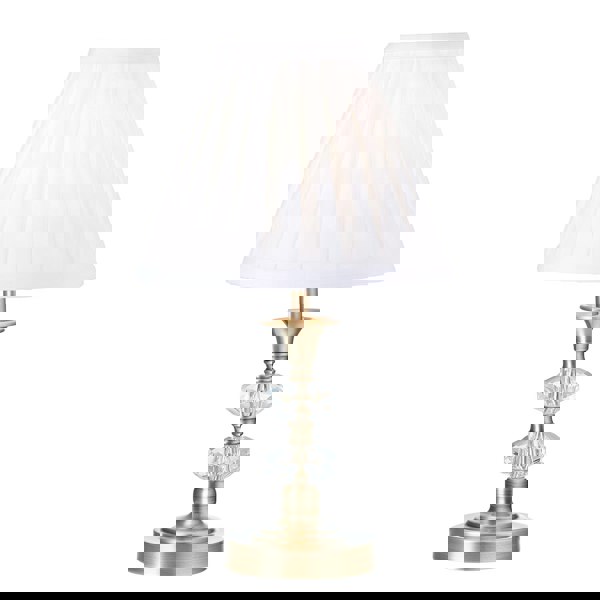 Features clear etched acrylic stones which give a crystal effect when light hits them, also includes off-white pleated cotton fabric lamp shade.