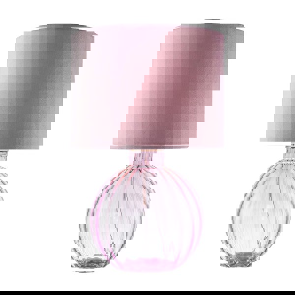 Contemporary and sleek table lamp with striking lilac ribbed circular glass base.